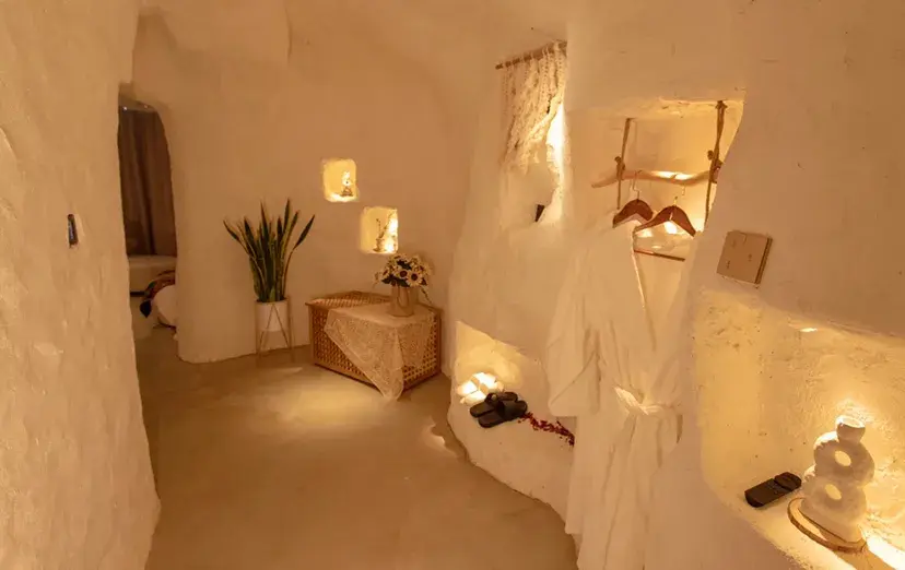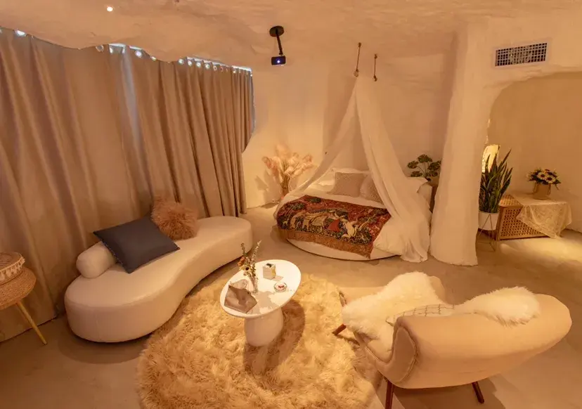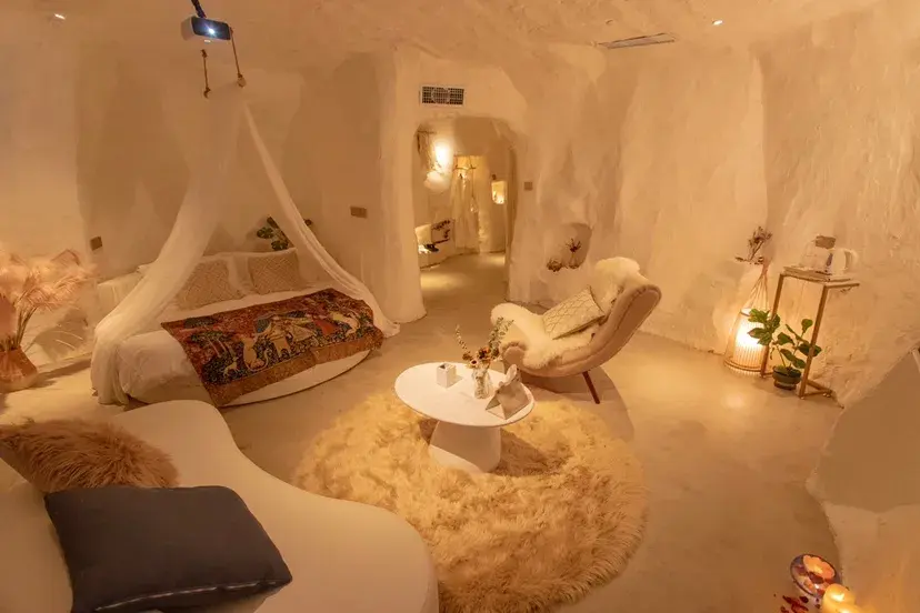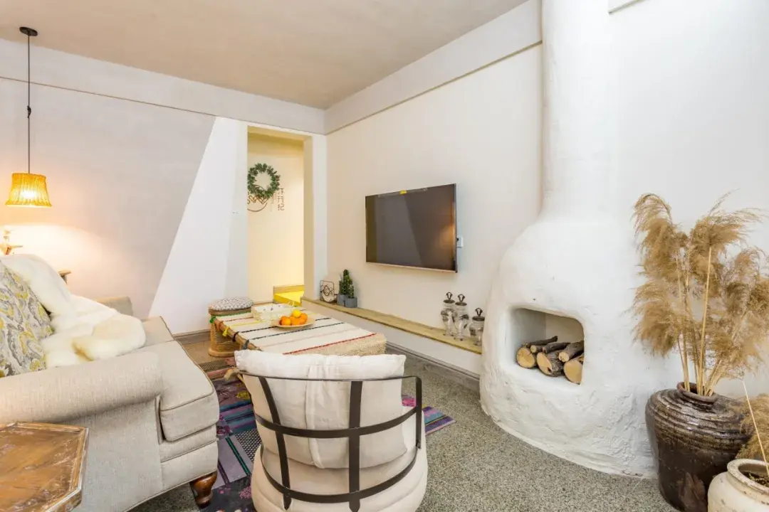 民宿的设想感超强,打造出神似洞窟的温暖感。整体的气概看上去简洁又温馨。民宿内的设备更是齐备,从冰箱到洗衣机,再到厨房用品。就仿佛回到家一般的自由。