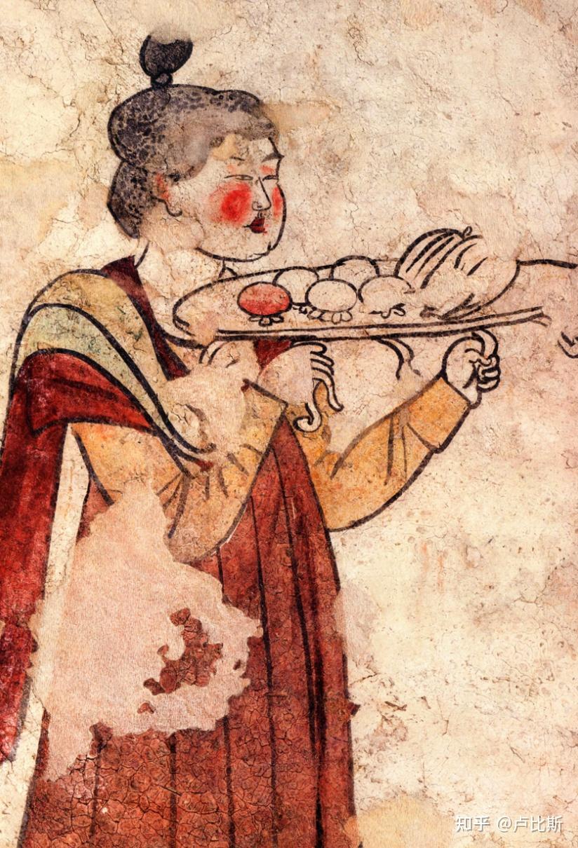 那幅壁画的墓仆人是房陵大长公主,就是唐高祖李渊的第六个女儿。该图中侍女所托的盘子里就有“柿子”,可见在唐代,柿子就是王公贵族之家喜好吃的生果之一。