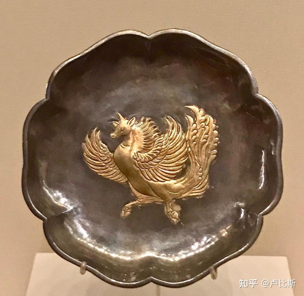那件鎏金飞廉纹六曲银盘也是出土于西安何家村的一件宝物,银盘为六曲葵花形,窄平折沿,浅腹平底,盘心出凸起并剔刻出一只鼓翼扬尾、偶蹄双足、牛首独角、鸟身凤尾的动物形象。那件银盘的纹饰很奇特,有学者曾把那件银盘上的神兽命名为翼牛,因其形为牛首鸟身,并双翼展翅。也有学者称其为异兽、飞廉。飞廉是中国古代神话传说中的风神,“前望舒使前驱兮,后飞廉使奔属”,“飞廉风伯也”。现实上,飞廉在其时的形象是多种多样的,有牛首鸟身、鹿首鸟身和马首鸟身等。也有学者认为飞廉纹饰唐代罗致了外来器物的粉饰动物的做法,又参加本土飞廉造做出来的。