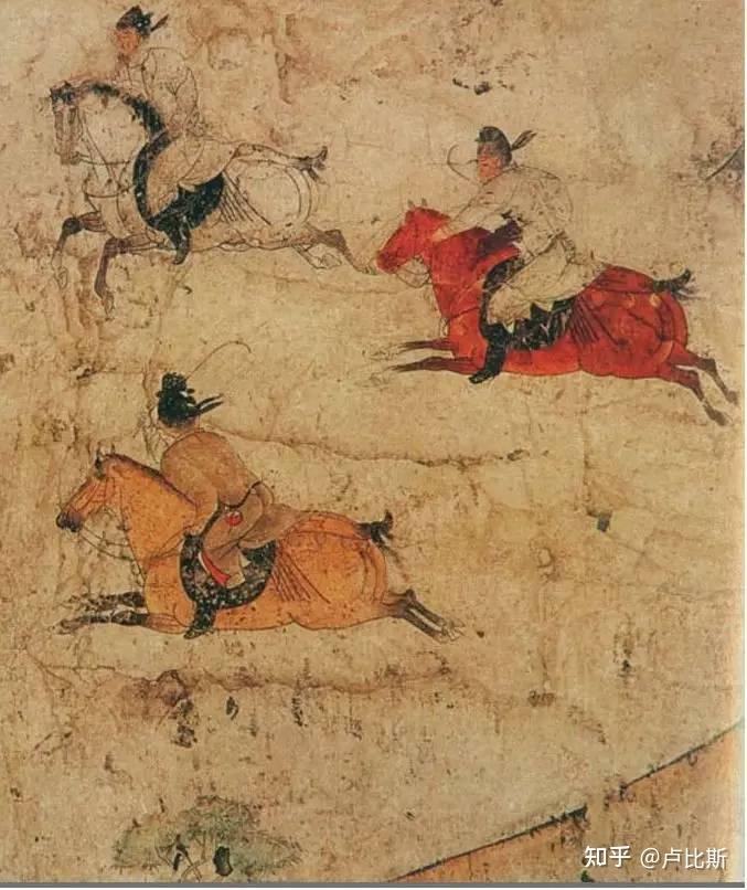 《马球图》1971年出土于陕西省乾县章怀太子李贤墓。图绘于墓道西壁。有20余骑马人物,均着深浅两色窄袖长袍,戴幞头,穿黑靴。壁画凸起五个持偃月球杖的骑者驱马抢球。前一骑做反身击球状,其余纵马迎击。后10余骑人马,行者骑枣红马,或山间奔行,或驰骋腾空。行者着绿色长袍,红翻领,伫目凝思,无球杖。布景衬起伏山峦,五颗孤零零的古树装点在空阔的画面上,与墓道东壁的“出行图”中的古树遥相对应。此图是有关马球运动最早的形象材料。