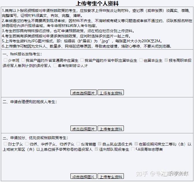 若考生没有选择具有特殊报名资格或可申请赐顾帮衬政策,则红色夺目提醒他不需要上传小我材料。