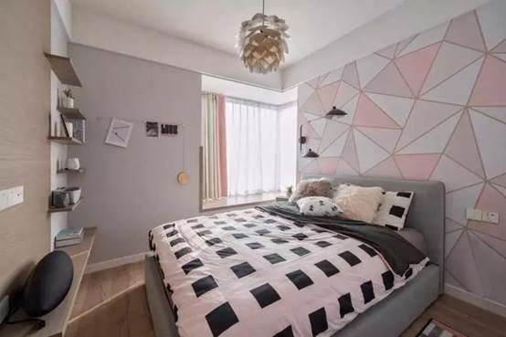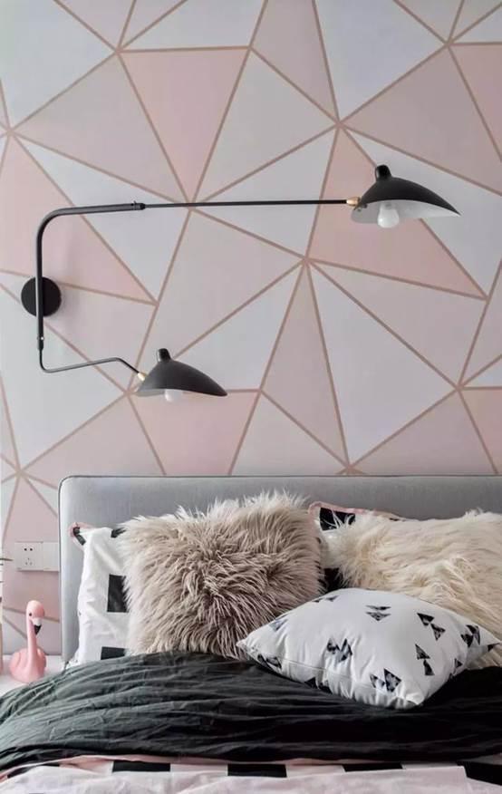 卧室的颜值实的太高了!整体色彩搭配协调,有一种暖暖的温馨感。尤其是床头那粉色做为主色彩的几何斑纹壁纸,和整个设想协调的融在一路。