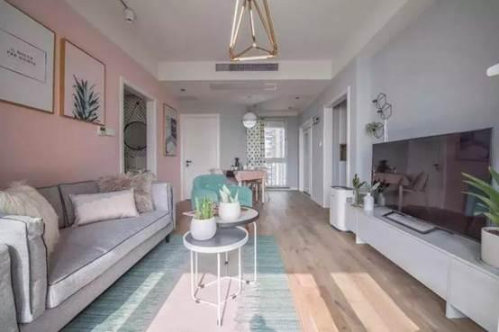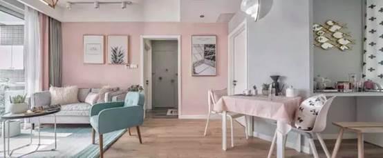 沙发布景墙的整面墙壁都是粉色的,出格有少女感。搭配上灰色的主沙发和蓝色的单人沙发,觉得很温馨。