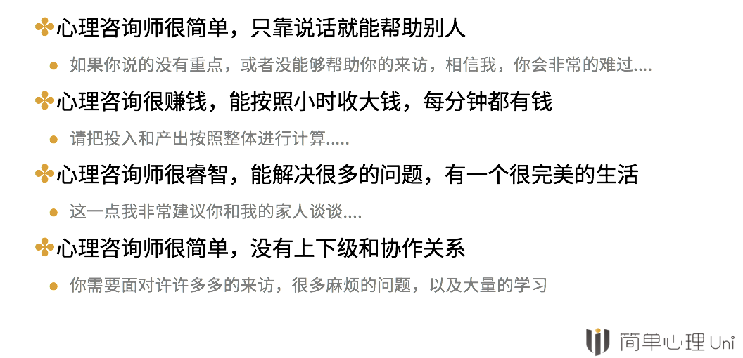 入门小TIP什么是适宜的培训?简单心理的Uni培训我觉得十分的适宜,他们的课程设想比力系统合理,各个门户的比例十分的平衡,并且简单心理的教师们都长短常落地的实战派。根本上那些教师大部门都是以征询为生的人。课程还有热线练习、预征询、高阶练习,一步一步带你进入到「征询师」行业。