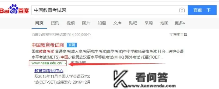 1、翻开百度,停止搜刮【中国教育测验网】,必然要看对网址http://www.neea.edu.cn/ 。如图所示:
