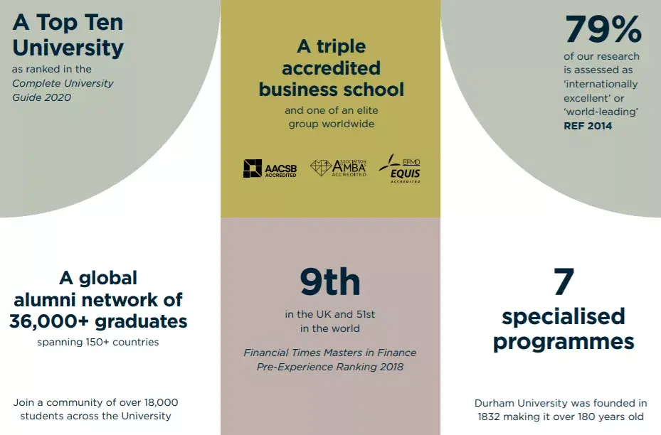 Masters in Finance项目布景杜伦大学商学院拥有AMBA、AASCB、EQUIS三重认证,同时也是CFA合做院校,部门MSc金融类硕士课程具备CFA认证,课程涵盖了70%以上的CFA测验内容。在英国本地有着浩瀚的合做企业,非常有利于商学院学生寻找工做时机。