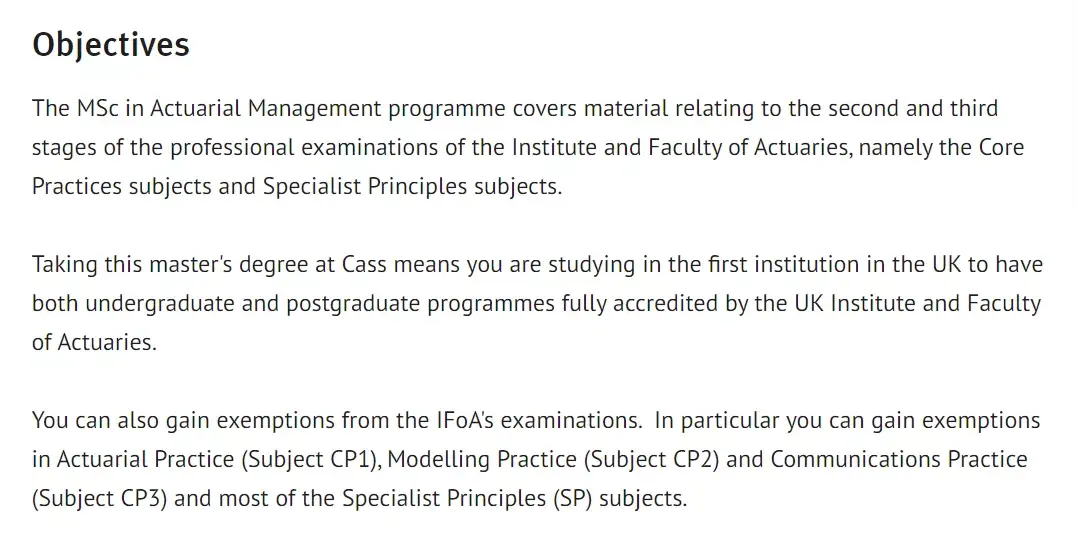 精算类专业是卡斯商学院的强势专业,校友普遍散布在世界保险金融圈,在业内享有极高口碑。包罗精算办理(MSc in Actuarial Management)和精算科学(MSc Actuarial Science),能够免考部门英国精算师测验项目(IFoA)。