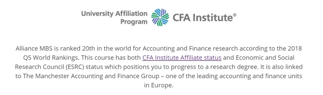 《卫报》2019年英国大学中国申请者人数增加30%曼彻斯特大学是特许金融阐发师(CFA)协会的认证合做伙伴,管帐与金融专业(MSc Accounting and Finance)被英国官方科研程度评估RAE星级评定为更高级,比拟零丁的管帐专业和金融专业,管帐与金融专业可选择的选修课范畴更普遍。