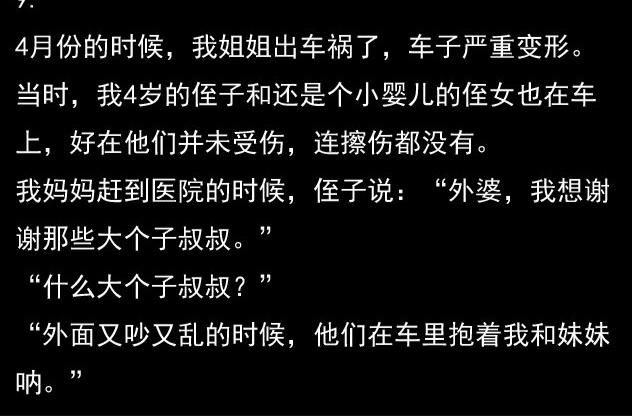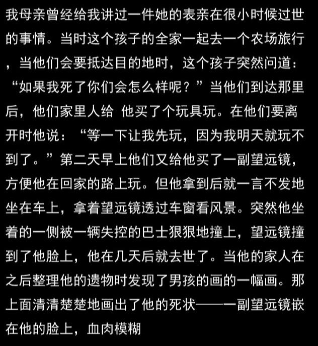 4.❤️父亲因为想骗7岁儿子的保险金,他骗儿子窗外有标致的小鸟将他推下了楼。几年后他的第二个儿子也7岁了。有一天儿子在窗边玩耍,他很怕儿子掉下去就从背后抱紧儿子,正筹办说话, 儿子转过甚幽幽说了一句 “爸爸 你还要把我推下去第二遍吗?”
