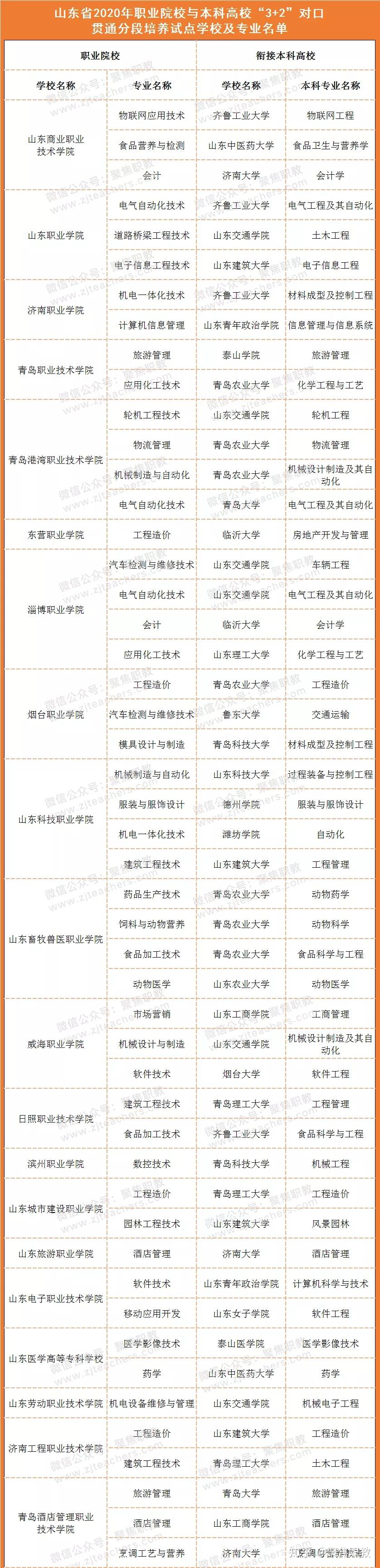 山东省2020年职业院校与本科高校” 3+2”对口贯穿分段培育试点学校及专业名单