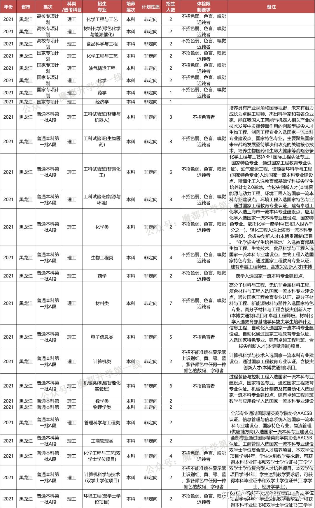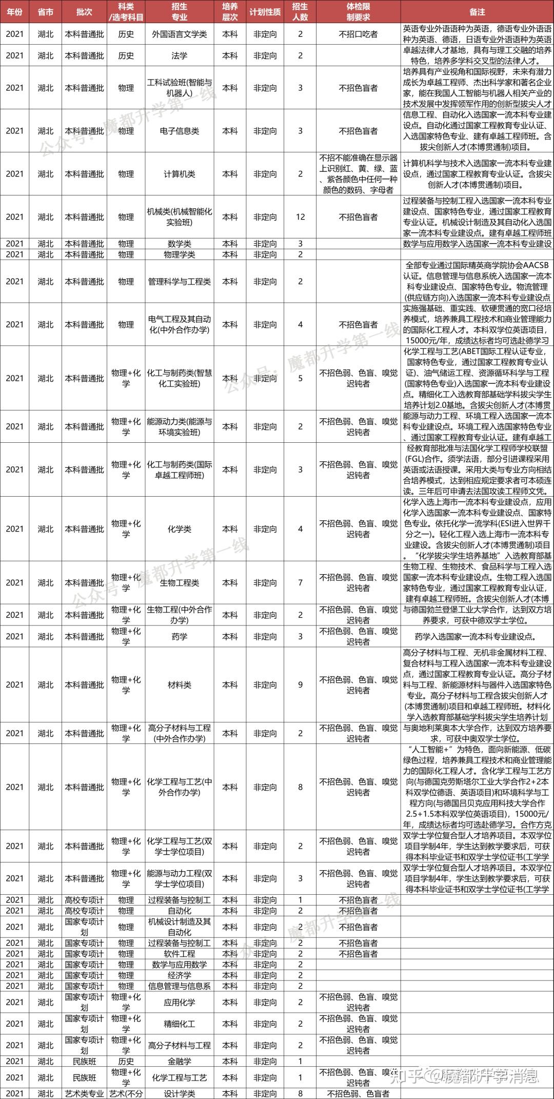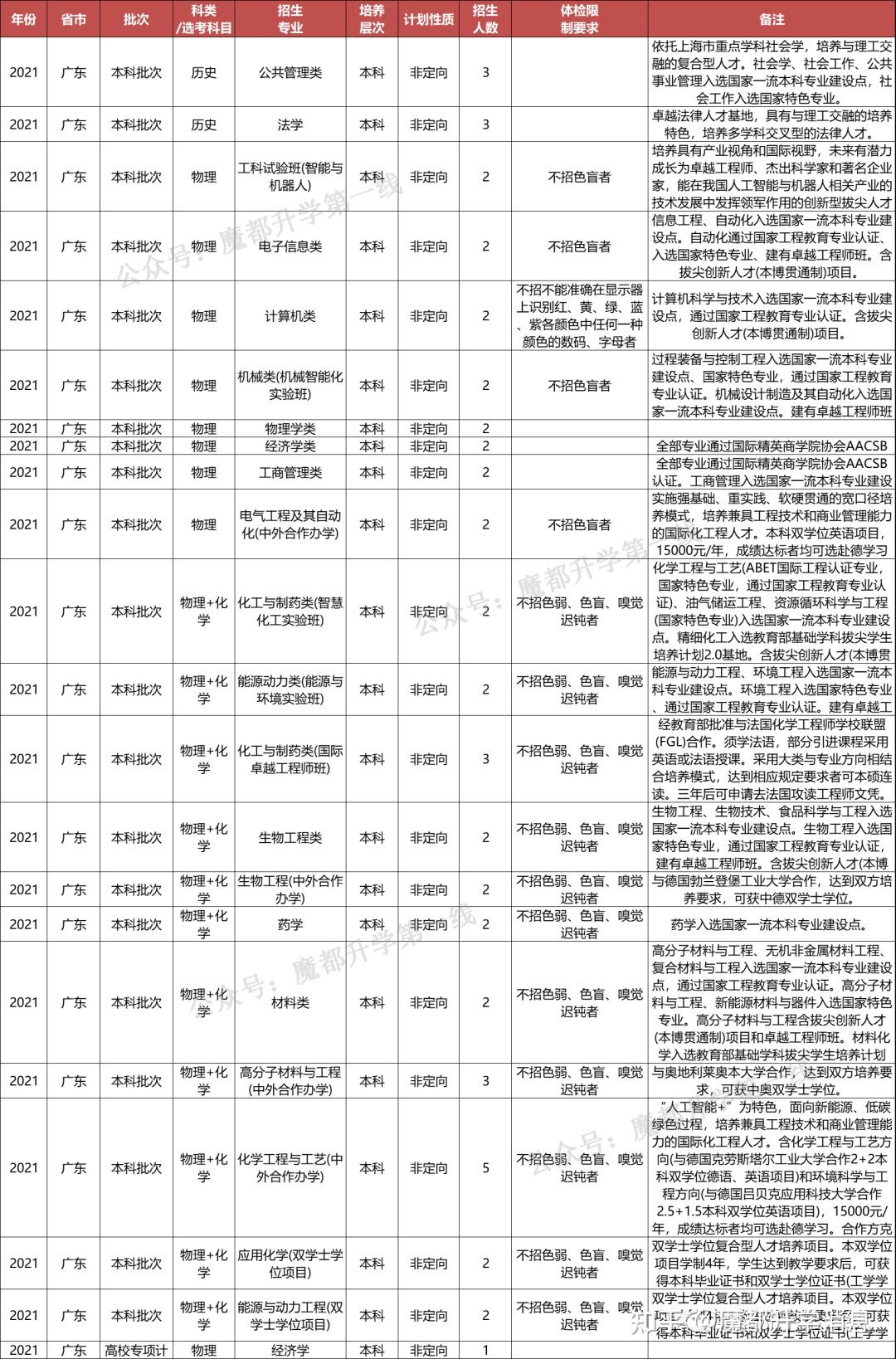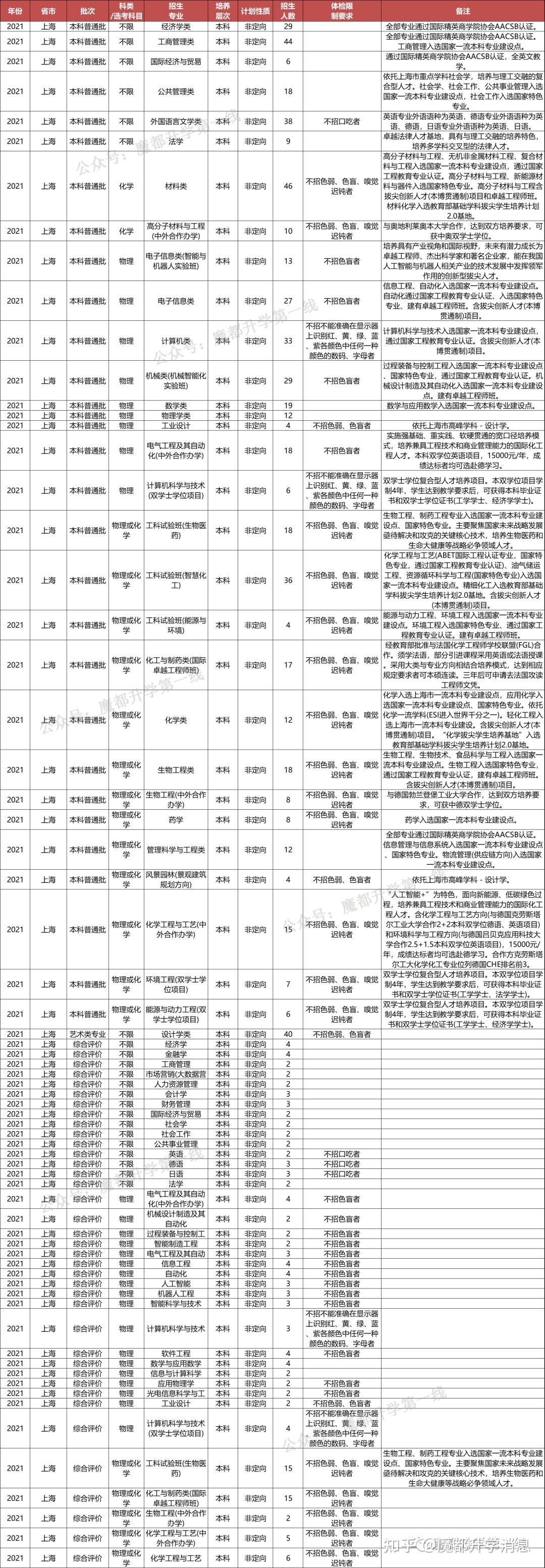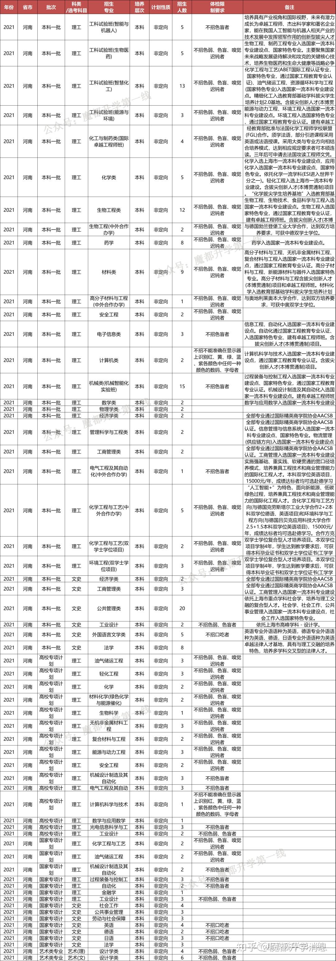 华东理工大学2021年招生专业(类)及体检限造、招生科类及选考科目要求