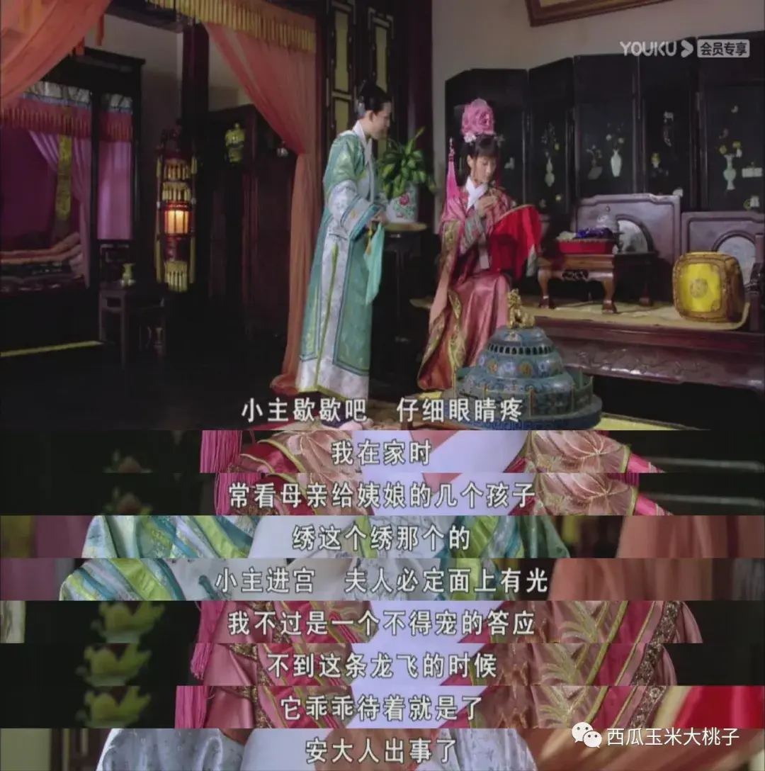 安陵容和宝鹃聊起来,说到安陵容在家时经常看到她娘给姨娘的孩子绣肚兜。安陵容的娘是纯包子,可安陵容是农夫与蛇的阿谁蛇。
