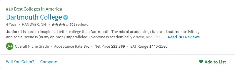 ● 达特茅斯学院表示不俗,从去年的第15名一会儿升到了第10名,冲入了 Top10 榜单。