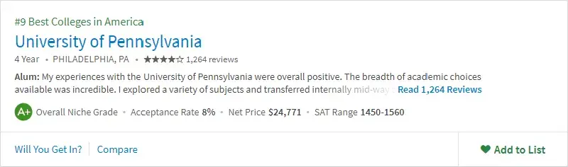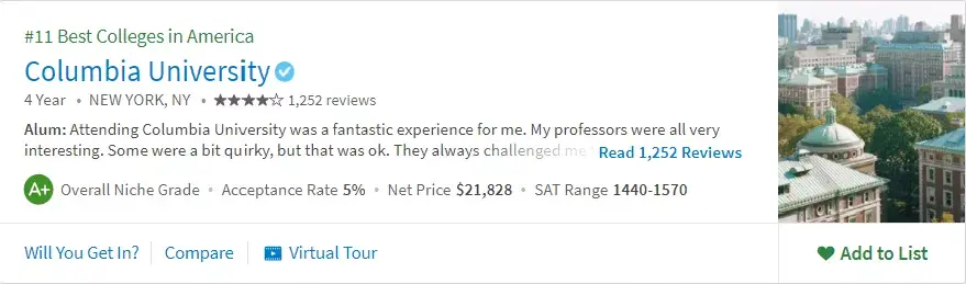 Niche 拥有近 500,000 条来自实在学生的大学评论——从宿舍到传授,八面玲珑,比互联网上任何其他处所的大学评论都多。随意点开一所学校,所有数十条以至上千条来自实在学生的评论和反应。如今已经进入2022年申请季,关于筹办选校的同窗,在参考其他学术类榜单的同时,也能够来 Niche 上看看那些评论。