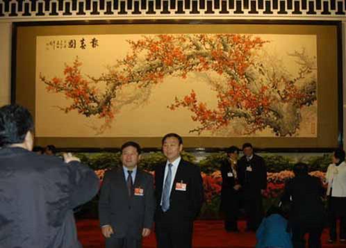 那幅梅花做的做者是中国出名中国画画家王成喜,现为全国政协委员、中国美术家协会理事、中国书法家协会会员、全国政协书画室副主任、国度一级美术师,其巨幅梅花佳做在北京的 *** 勤政殿( *** 中央政治局会议室)、天安门城楼中央大厅、人民大礼堂三楼中央大厅、毛主席纪念堂、外交部贵客厅等,国外的诸多总统府、皇宫、国会等重要场合的次要位置均有陈列悬挂。