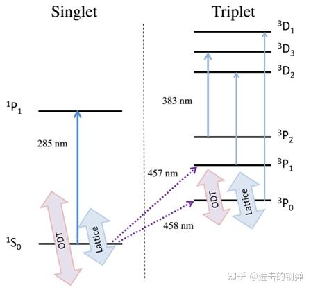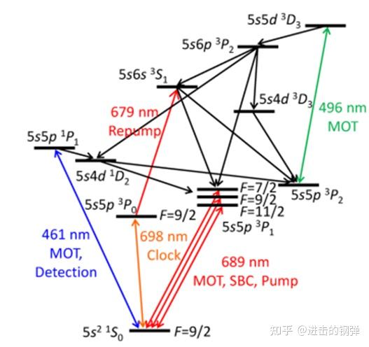 与Yb差别的是,Sr同位素较少,次要用来做钟的同位素有费米子87Sr和玻色子88Sr,87Sr常用跃迁如下图: