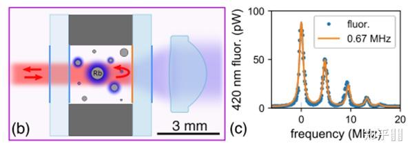 (b) The microfabricated vapor cell has optically coated windows and an aspheric collection optic directs the blue fluorescence from the atoms onto the PMT. (c) Spectrum of two of the hyperfine components of the two-photon transition and corresponding fit showing a linewidth of ~6