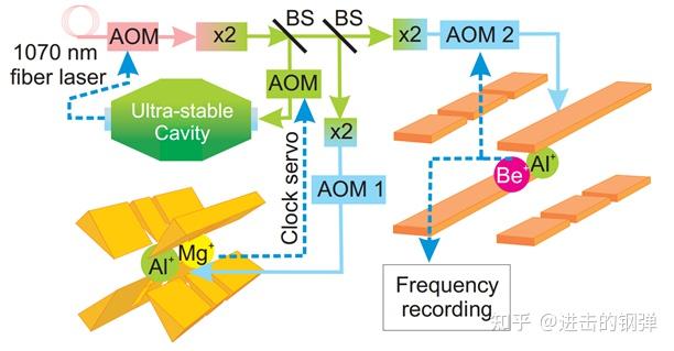 两台铝离子光钟,此中一台为Al+/Mg+离子光钟,另一台为Al+/Be+离子光钟,此中Al+是用于闭环的光谱离子,Mg+和Be+均是用于协同冷却和量子逻辑光谱的逻辑粒子(Al+粒子光钟需要用到协同冷却是因为针对Al+ 1S0→1P1的166nm持续极紫外光太难获得了,但印象中仿佛国内有个科研小组和国内做Al+钟的合做搞出来了,详细文章忘记了)