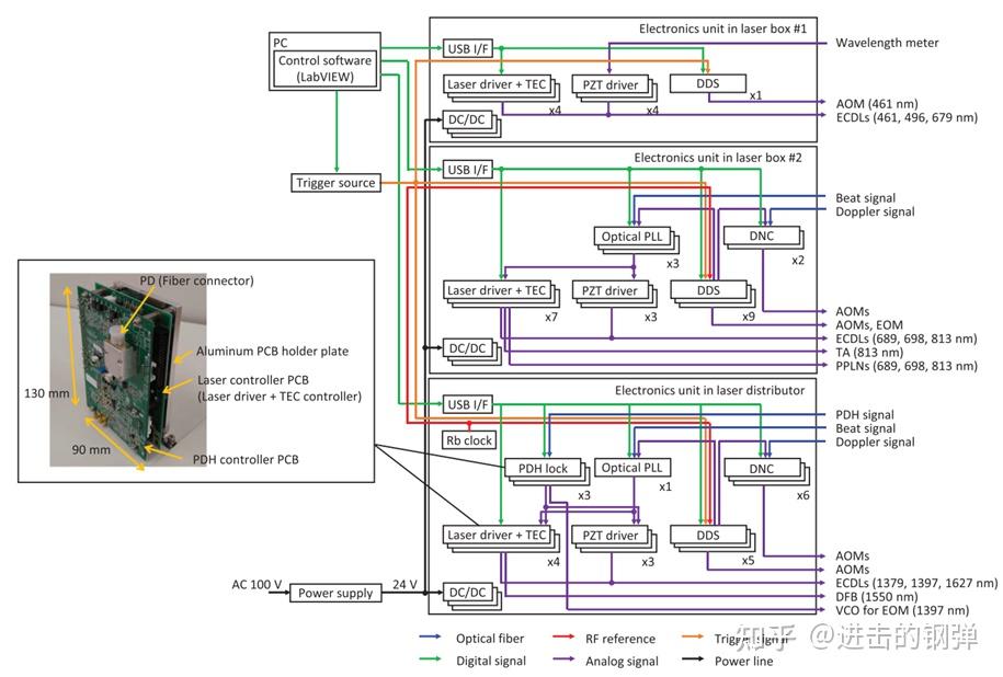 上图为RIKEN搬到东京播送电视塔上的可挪动光钟,此中包罗Laser distributor,2个laser box #1和2个laser box #2,以及2个原子探测室。光谱原子探测室由760*710*550厚的磁屏障质料包裹,而且内部做了4层控温温控在245K,所有所需的激光通过饱偏光纤送入原子实空室,原子实空室实空控造在E-8Pa级别,在实空室下面则包罗了离子泵控造器、BBR shield温控(即冷腔温控),线圈的电流控造器,时序输出板以及PC电脑(运行Labview法式以及通过USB I/F总线形式控造各路PCB板输出)。