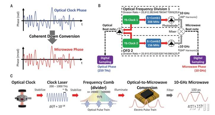 3. 其他光钟相关尝试 3.1 光频下转换(Coherent optical clock down-conversion for microwave frequencies with 1E-18 instability)若是说光钟是将钟激光闭环到冷原子上,那么将光频通过光梳转换成射频才算实正意义上将光钟落地(没准将来也会有设备能够间接用钟激光当频次参考呢!?)