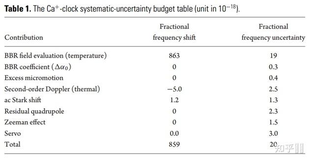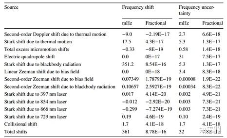 Uncertainty budge for the systematic shifts evaluation of the transportable Ca+ optical clock. Numbers are shown in E-17[25]以及最新的不不变度和不确定度[27]