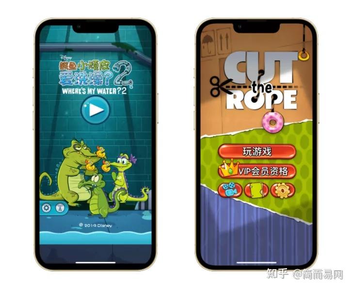 《鳄鱼小顽皮爱洗澡》是一款由 Creature Feep 开发、Disney Mobile 发行的益智游戏。值得一提的是,游戏中的鳄鱼角色是迪士尼针敌手机游戏所设想的全新角色,从未呈现在此前的动漫中。而《割绳子》则是俄罗斯 ZeptoLab 公司开发,由「工做室杀手」美国艺电发行。
