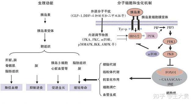1胰岛素的生化机造胰岛素通过与胰岛素受体连系起头一系列反响,激活內部的酪酸激酶活性,磷酸化胰岛素受体本身的p亚基;而胰岛素受体是细胞外表的一种糖卵白是由两个Q亚单元和两个p亚单元所构成的异四聚体。o亚基及D亚基通-s-s-健相连,o亚基在细胞膜外外表,具有与胰岛素连系的部位。D亚基跨膜存在胞浆,p亚基具有酪酸卵白激酶活性,酪氨酸激酶具有ATP连系的部位。而活化的受体具有酪氨酸酶的活性,能够诱导非受体卵白的磷酸化,如胰岛素受体基量1等,被酪氨酸磷酸化的IRS-1进而激活磷脂酰肌醇3激酶,P13激酶是介入下流生物学反响的重要的传导器,与胰岛素介导的葡萄糖转运卵白4转运和葡萄糖的运送有关。