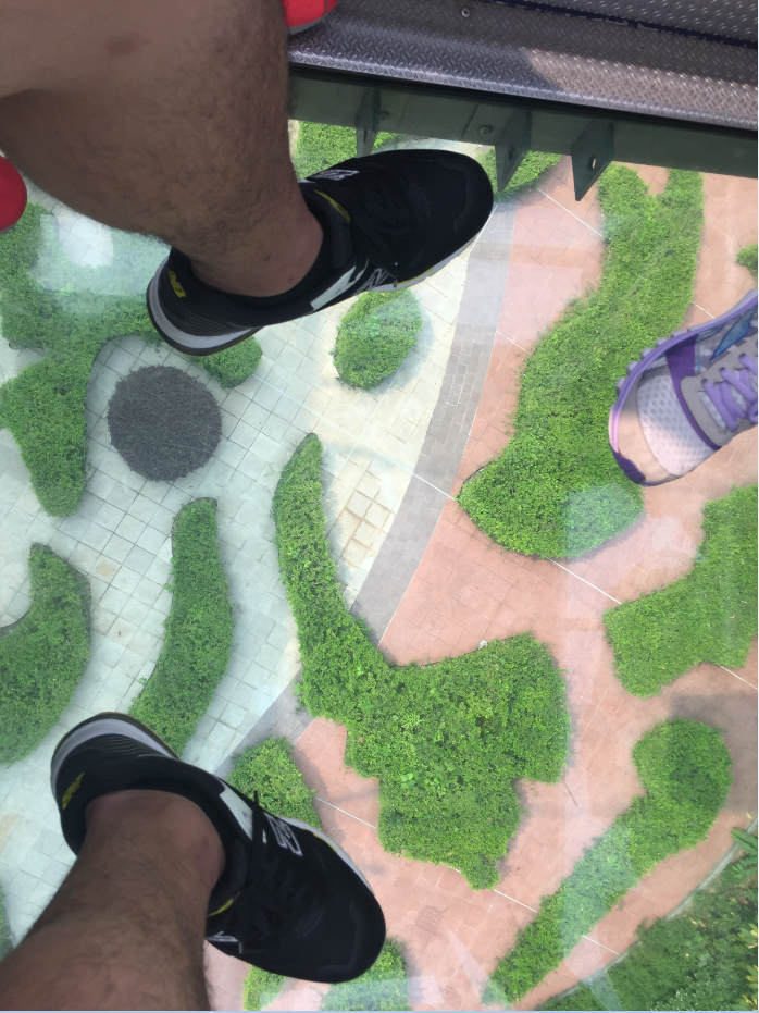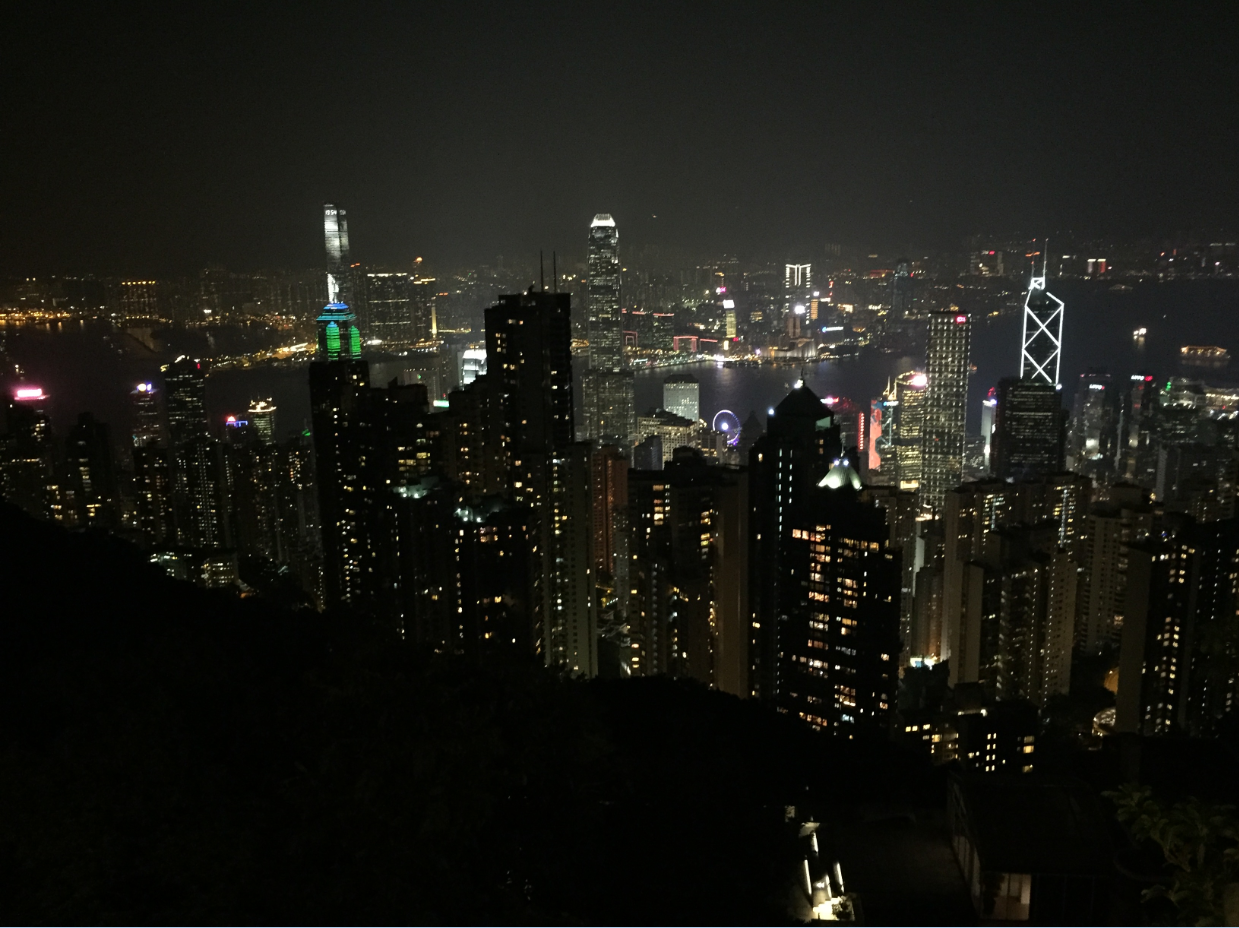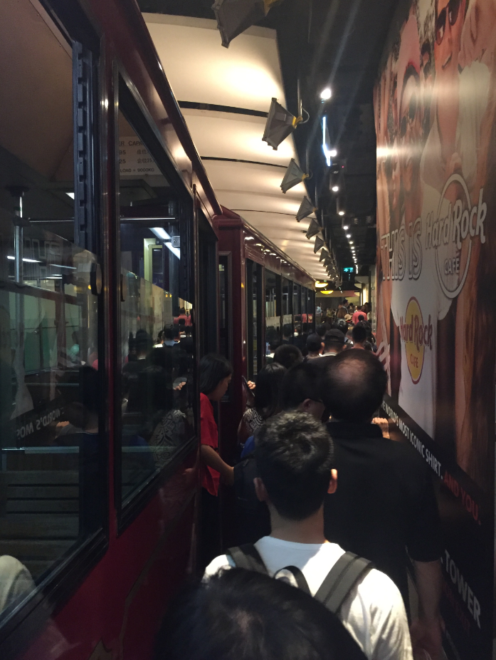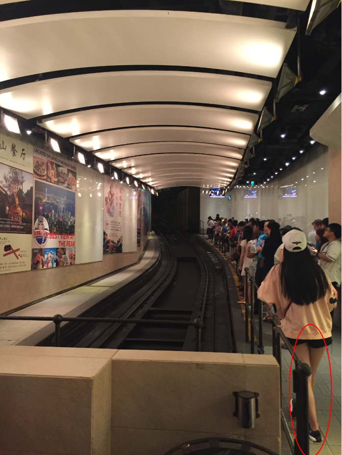 (妹子腿不错)那个缆车很好玩,最陡的时候大要30°角,4分钟不到就到山顶了。去山顶看香港夜景是很好的,我也保举晚上去。晚上人也多。我们非节假日去都得排很久,上山30分钟,下山30分钟。