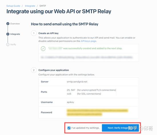 继续并选中“我已经更新了我的设置”框。然后,单击“下一步:验证集成”按钮。