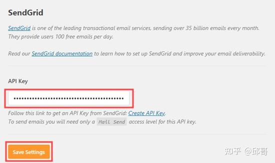 在屏幕底部,您将看到一个用于输入 SendGrid API 密钥的框。只需将其复造并粘贴到此处,然后单击“保留设置”按钮。