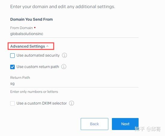 如今,在“您发送的域”框中输入您的域。在此下方,单击“高级设置”链接。那将开拓新的选择。