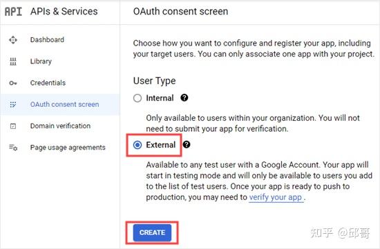 OAuth 同意屏幕将在新选项卡中翻开。在那里,您需要选择“外部”类型,然后单击“创建”按钮。