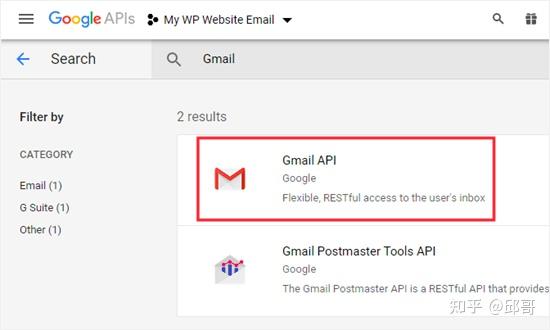 然后页面将刷新。之一个成果应该是 Gmail API。继续并单击它。
