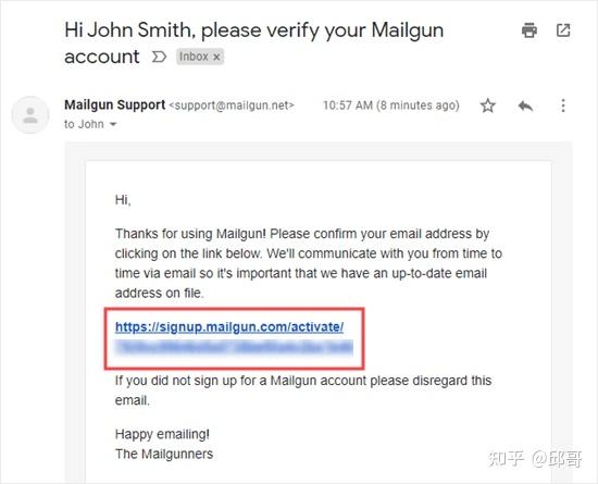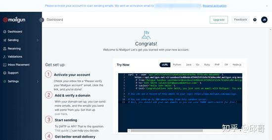 在继续之前,请在您的电子邮件收件箱中查找来自 Mailgun 的验证电子邮件。您需要单击此电子邮件中的链接来激活您的 Mailgun 帐户。