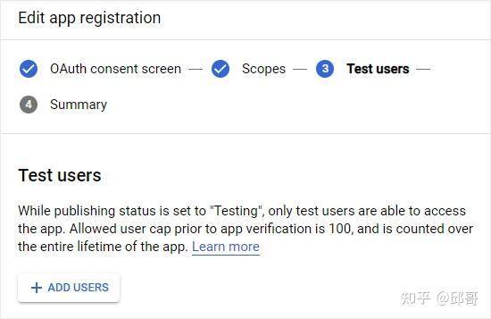 只需单击范畴屏幕上的“保留并继续”按钮。在“测试用户”屏幕上,单击“添加用户”按钮并输入您的 Gmail 地址。