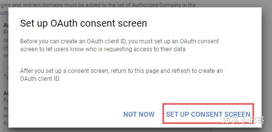 在此之后,您将看到一个弹出窗口,提醒您创建一个 OAuth 同意屏幕。如今只需单击“设置同意屏幕”链接即可。