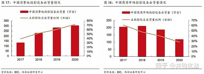 按照IDC统计数据,2020年中国投影仪总出货量为417万台。此中,消费级市场投影仪出货量300万台,占比72%,2017~2020年CAGR为32%。与此同时,商用投影仪出货量则从2017年的186万台下降至2020年的117万台,年均匀降幅为14.32%。
