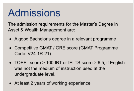 商学院下的金融工程专业、管帐专业和贸易阐发专业等的要求如下图,要求获得A good bachelor’s degree,申明不单要获得本科学位,还要GPA足够高,一般要在80分以上。关于托福/雅思、GRE/GMAT成就也是“good”。按照我们的统计,托福一般要在90以上,雅思6.5以上,GRE不低于310,GMAT不低于580。