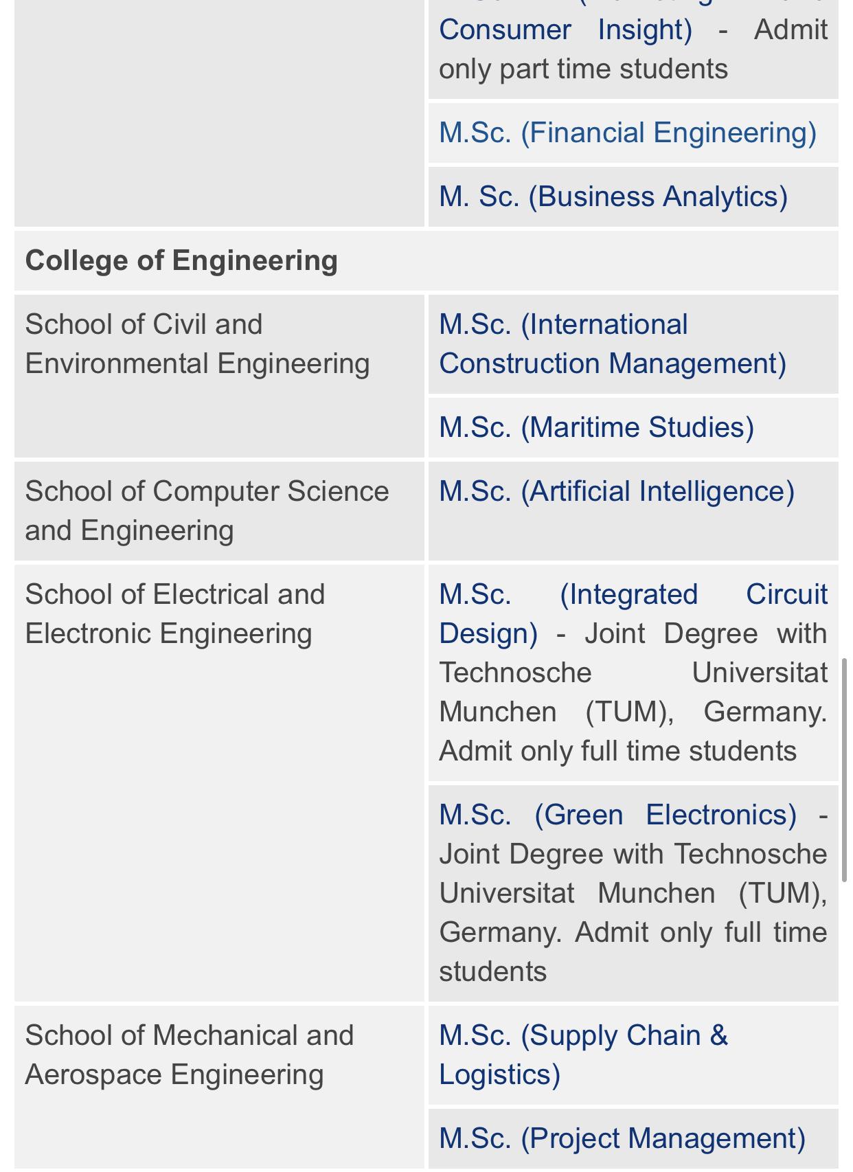 Construction Technology and Management、Environmental and Water ResourcesGeotechnical EngineeringMaritime StudiesStructures and MechanicsTransportation Engineering至于详细每个专业的介绍,和研究标的目的,各人能够去新加坡南洋理工大学的官网查询,起首进入以下网址,能够看到其各个专业,再点击有兴趣的专业就能够看到根本介绍,包罗开设课程、研究范畴等内容,还有申请要求,下面我们将详细介绍申请要求。