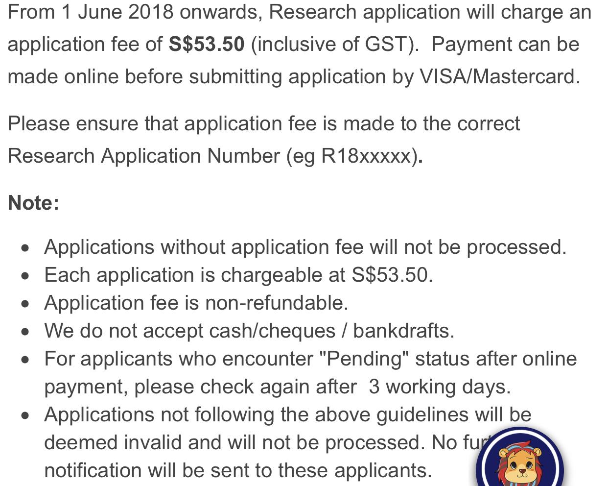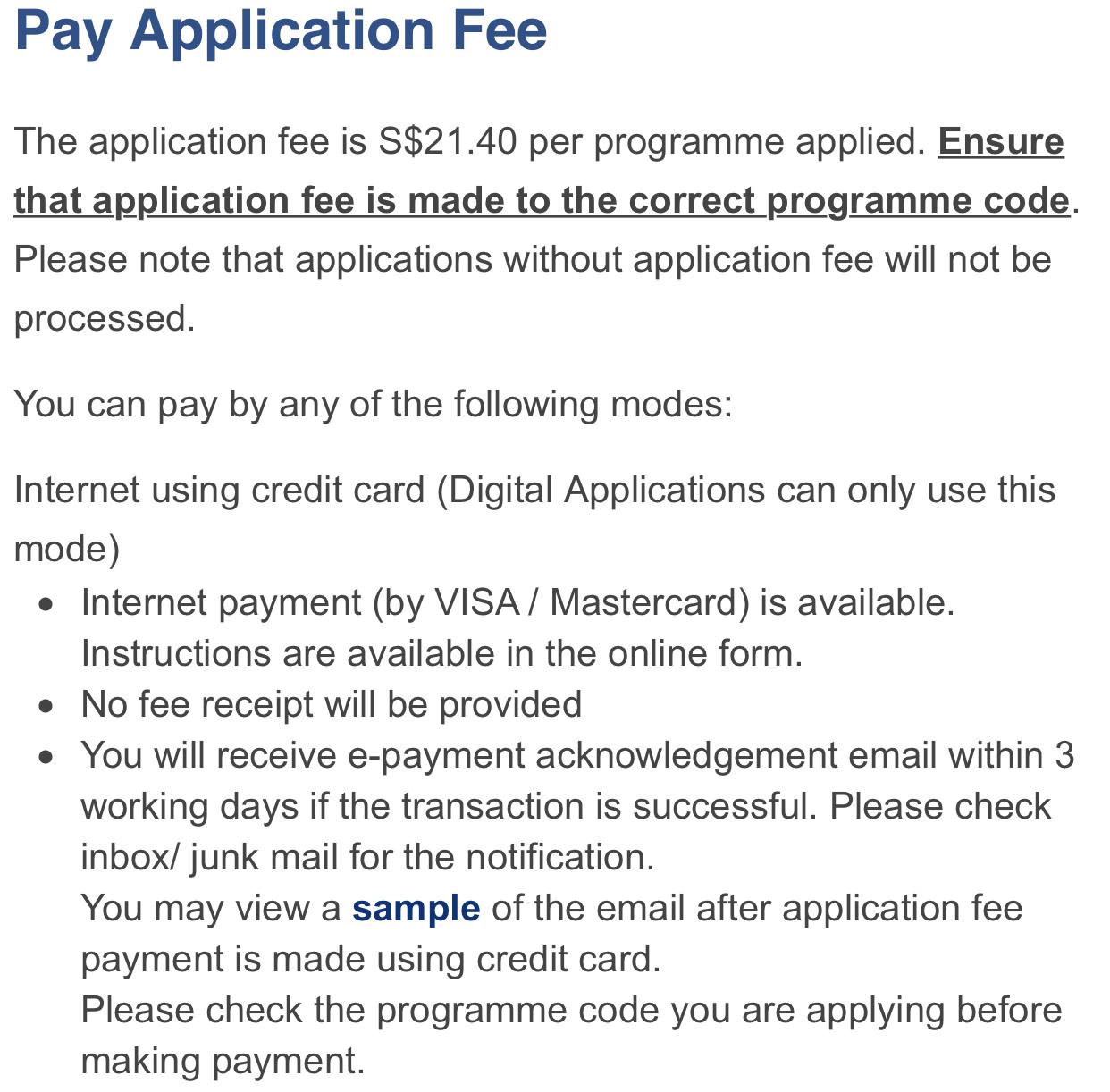 再说一下申请费用和申请时间。关于申请费用,在其官网上有明白规定,每个项目是58.5新币,并在要在提交申请质料前提交,详细可参考下图: