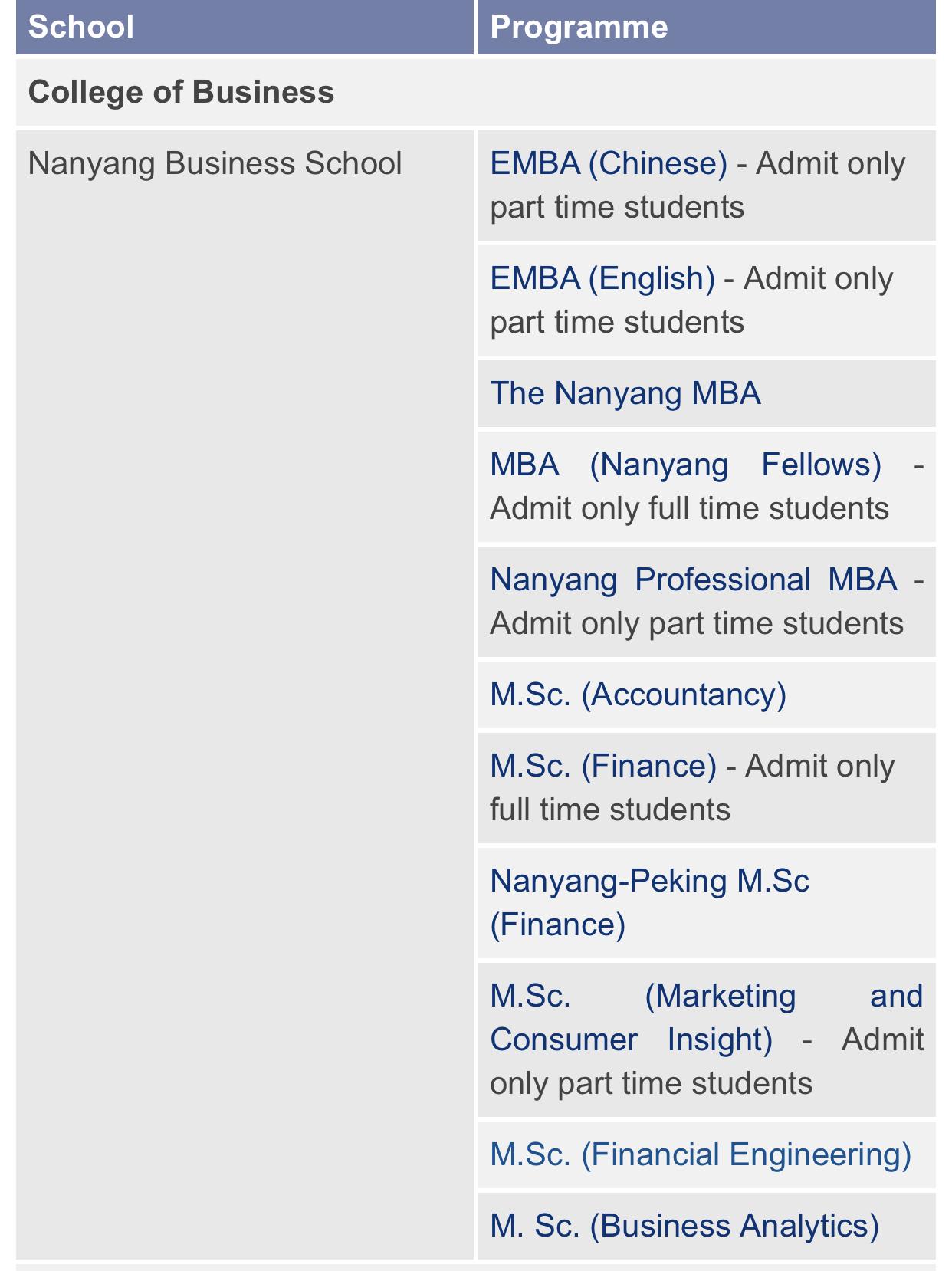 下面我们就针对我们国内学生能够申请的项目说一下,项目列表如下图所示,有的专业只承受非全日造申请,有的则只承受全日造申请。也有一些项目是新加坡南洋理工大学与其它大学结合培育的,好比,电子与电力工程学院下的两个专业都是和德国慕尼黑工业大学结合培育的。国度教育学院的指导与教育改动专业是和哥伦比亚大学结合培育的。别的,南洋理工大学的商学院也是很凶猛的,开设的管帐学、商学、MBA、EMBA、金融工程、金融学等本科和研究生课程遭到国际学术界和企业界的极大承认。要详细领会某个项目标研究标的目的、开设课程等情况能够通过下面的领会进入项目界面,再点击响应项目即可进入项目介绍界面。