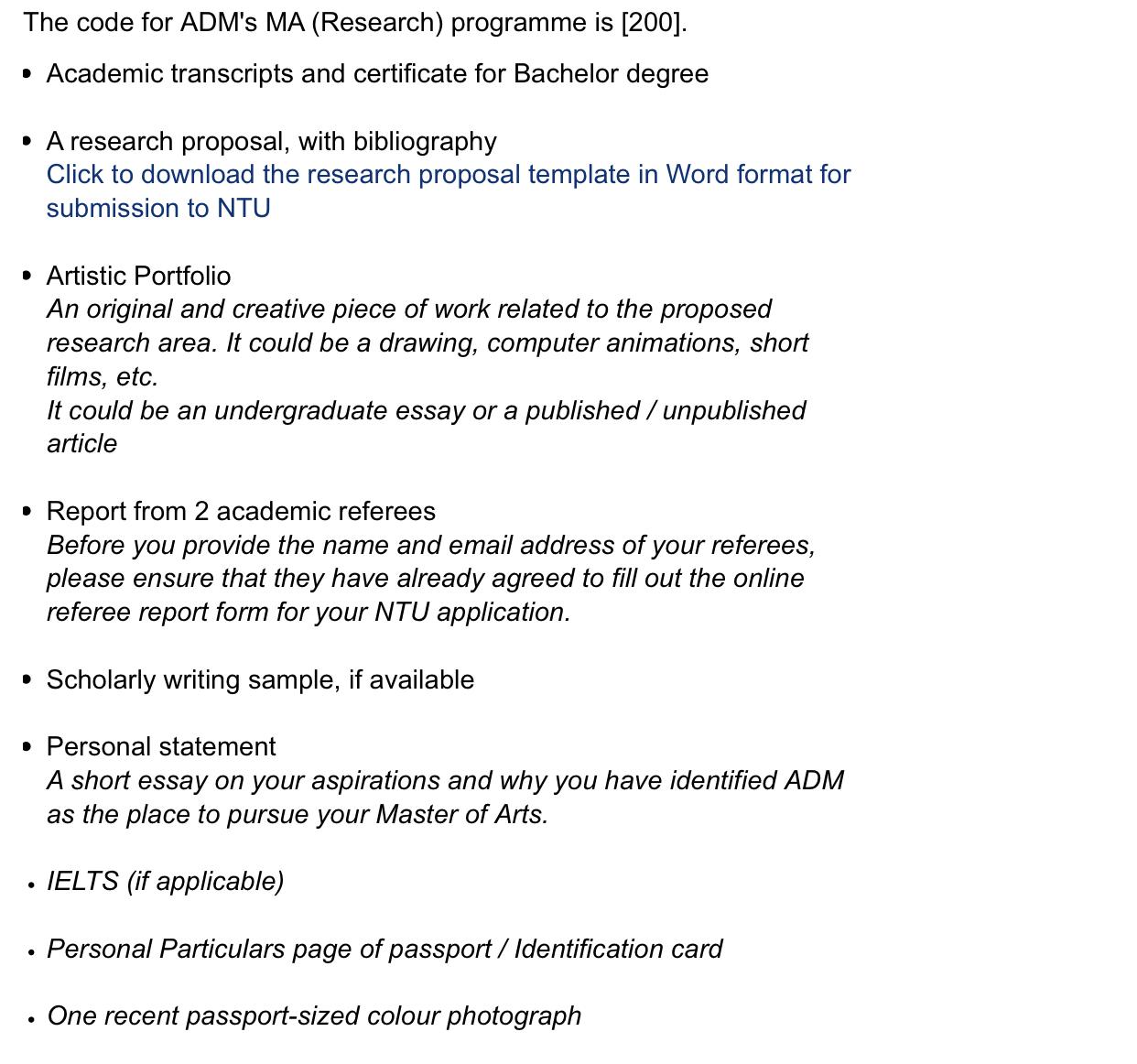 除了以上硬性分数的规定,申请时还需要提交一些支持文件,关于支持文件的要求,工学院下的各个专业要求根本一致,次要包罗身份证明质料、英语测验成就单、本科成就单、学位和学历证书、Referees Reports、研究方案、简历、获奖证书等等。但一些文科类专业会有本身的特殊要求,除了以上质料,还要求供给写做样品、做品集、小我陈说等,好比人文、社科和艺术专业,并且研究方案要求1000个单词摆布,要根据它们供给的模版来写,详细如下图: