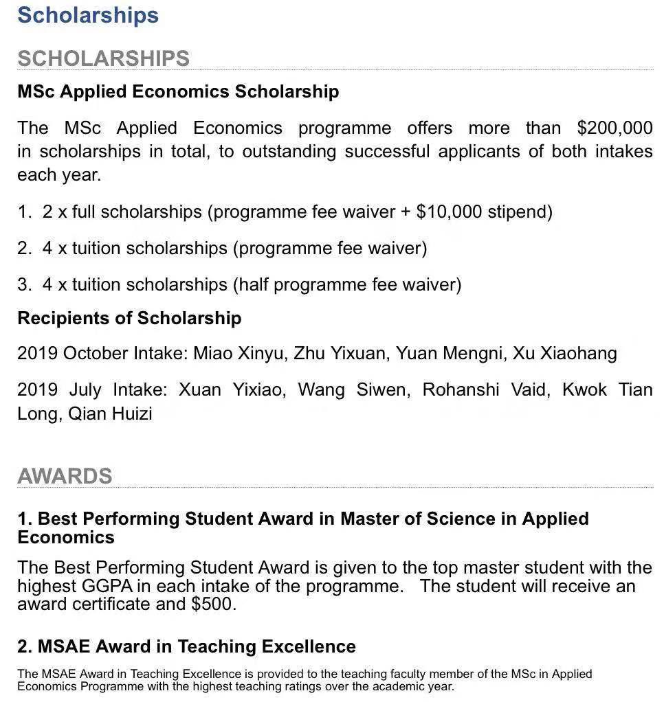 三、授课型硕士项目新加坡南洋理工大学的授课型硕士项目是以就业为导向,以授课为主。分为两类,一类是受帮助的项目,新加坡 *** 会供给大量膏火补助,并由教育部发放,由教育部负责办理,但那类项目不承受国际留学生申请。另一类是没有帮助的项目,也是我们国内学生能够申请的。那类项目没有新加坡 *** 的帮助,一般也没有奖学金,全数要公费。但有些专业可能会有专业奖学金,好比它的应用经济专业,其专业奖学金如下: