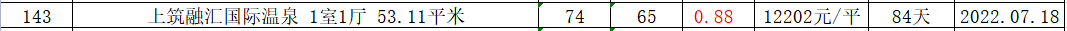 此中溢价率更低的房源是上筑融汇国际温泉小区的一套房源,溢价率为0.88,成交价比挂牌价低了9万,成交单价为12202元/㎡。