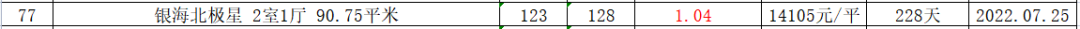 溢价率更高的房源是银海北极星小区的,那套房源的溢价率为1.04,成交总价比挂牌价高了5万,成交单价为14105元/㎡,成交周期228天。