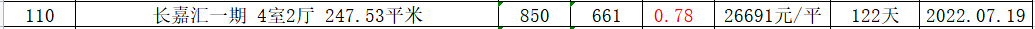 此中溢价率更低的是长嘉汇一期小区的房源,溢价率为0.78,成交价比挂牌价少了189万。