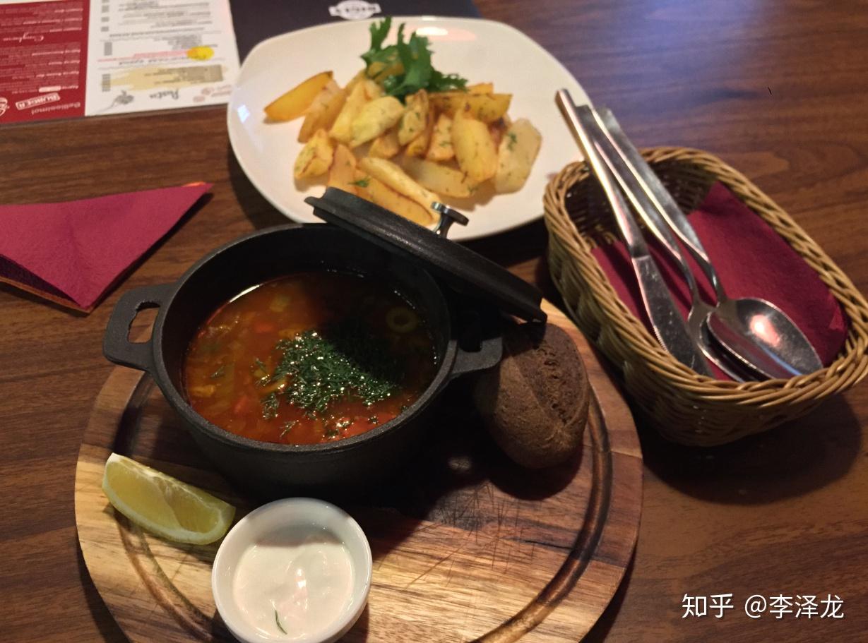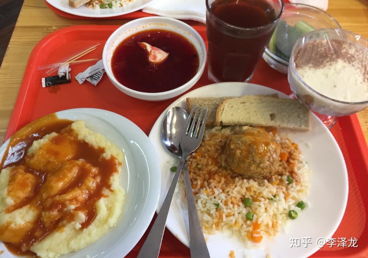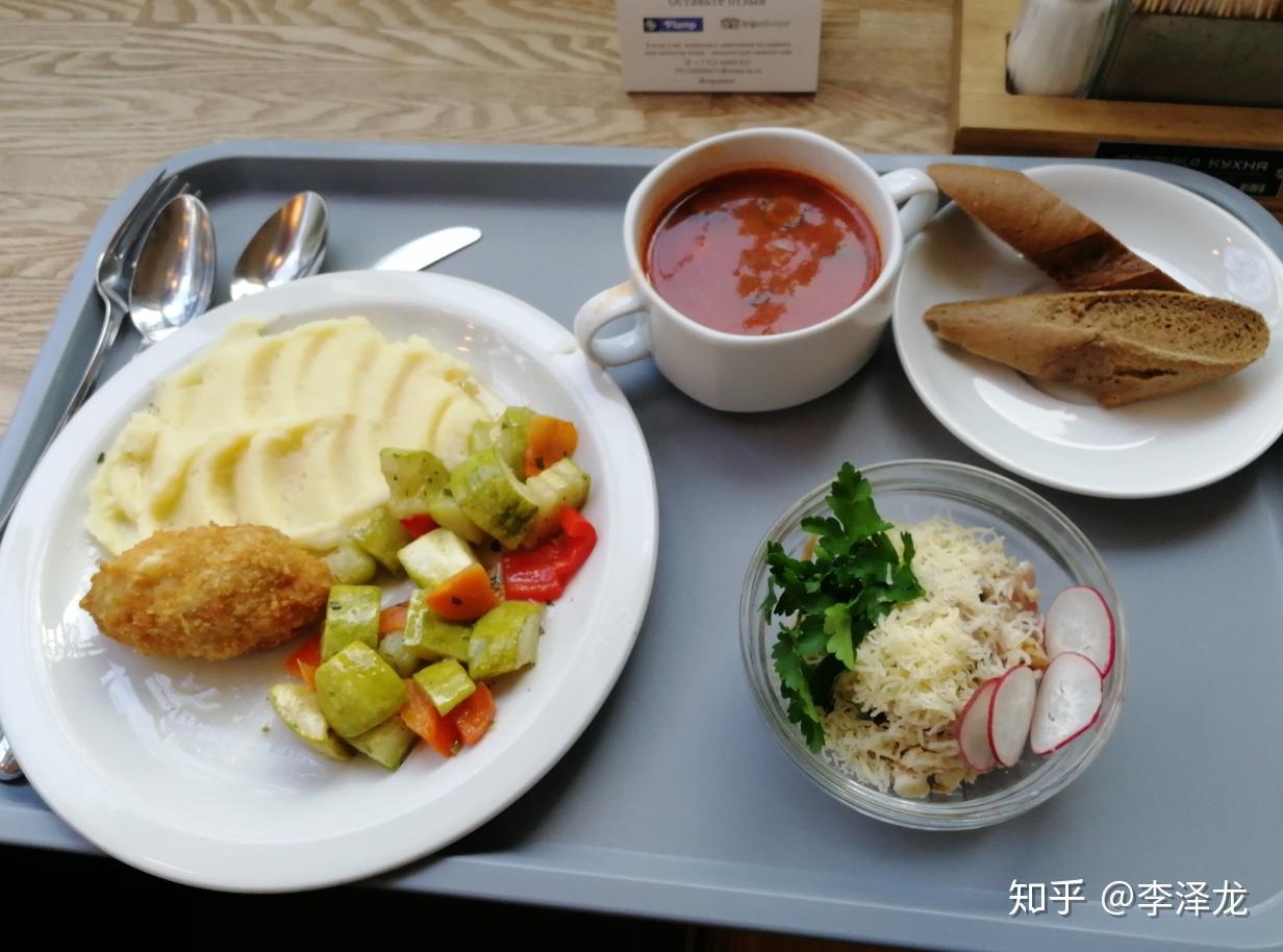 那是典型的一顿俄餐,右边绿色的是生的蔬菜做的沙拉(салаты),上面是一份红菜汤(борщ),右边是一份土豆泥配肉饼(пюре с катлетой),更底下是一份由土豆、豆子、美乃滋和胡萝卜做的沙拉甜点。典型的一顿俄罗斯菜,一份汤+主食+沙拉+一杯茶或者果汁那是乌拉尔联邦大学食堂的菜,一般来说俄餐比力简单,没有复杂的烹调手段,口味偏油腻、酸、甜,一般没有辣椒也是食堂菜