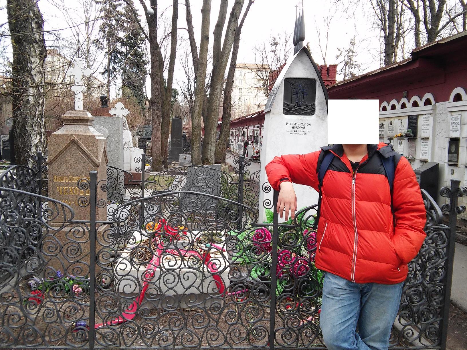 那是在莫斯科的新圣女公墓 , 那儿安葬了俄罗斯几乎所有汗青上有名的人,好比 赫鲁晓夫,图波列夫, 沙利亚宾,契诃夫,果戈里等等。 背后是《套中人》《胖子与瘦子》等小说的做者 - 契诃夫的泉台。