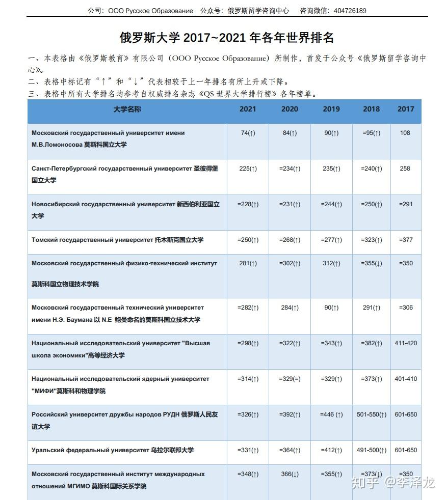 若是你不晓得上面我讲的那些学校,能够参考一下下面那份排名表格,在表中我参考了QS世界大学排名(QS Ranking 2021)的数据,把俄罗斯大学过去几年的排名数据都做了一个简单梳理,如许各人就大白俄罗斯大学大要是一个什么样的整体程度。