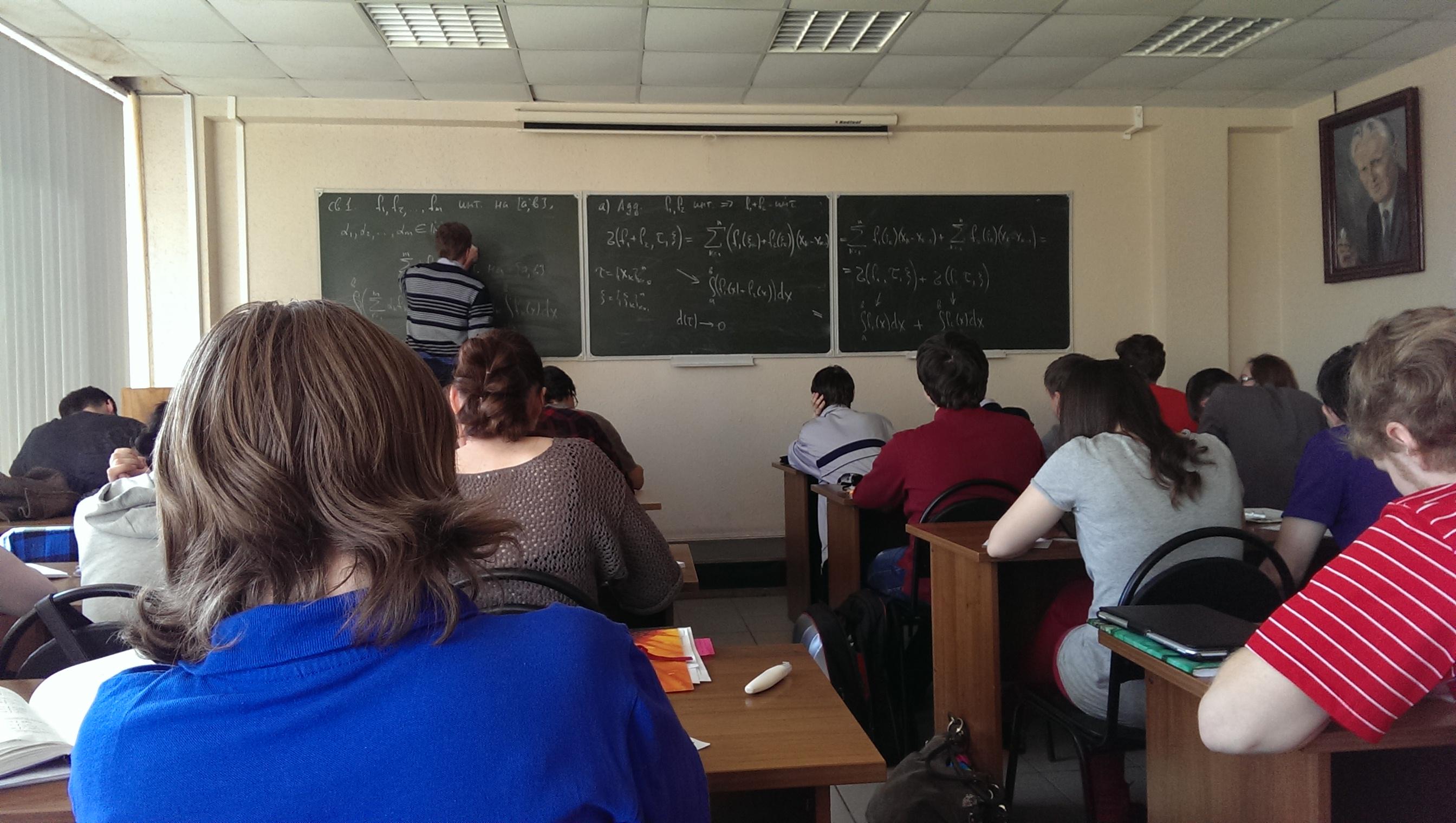 上课的时候的图片,我们是数学系,所以进修压力仍是很大的,头两年十分累,第三年比头两年还要累,大四略微轻松点,课程多、深度深,用的教材大大都仍是苏联时代的教材,每一本都是典范,例如柯斯特利金-《代数学教程》,甘马特 -《矩阵论》,吉米多维奇 - 《吉米多维奇习题册》,菲赫金哥尔茨 - 《微积分教程》,卓里奇 - 《数学阐发》 , 柯尔莫哥洛夫 - 《泛函阐发教程》 ,庞特利亚金 - 《常微分方程》 ,巴沙特 - 《复变函数论办法》,那汤松 - 《实变函数论》,马尔契夫 - 《理论力学》,Shrive - 《金融随机根底》 ,巴赫瓦洛夫 - 《数值办法》等